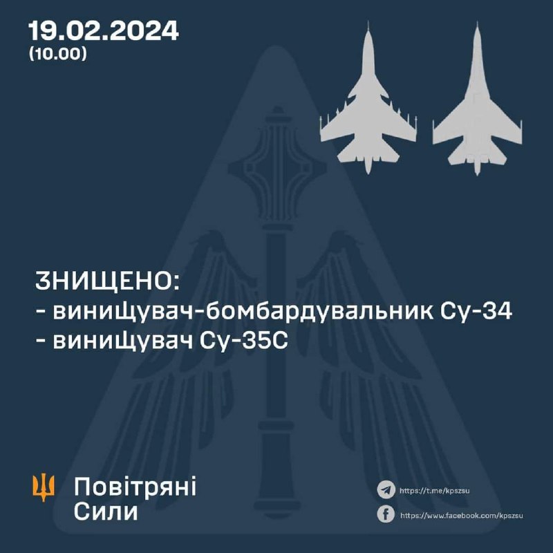 Сьогодні зранку на Східному напрямку знищено ще два ворожі літаки – винищувач-бомбардуваньник Су-34 та винищувач… 19.02.2024, Понеділок | 12:42 Автор допису: Голова Луганської обласної військової адміністрації Сьогодні зранку на Східному напрямку знищено ще два ворожі літаки – винищувач-бомбардуваньник Су-34 та винищувач Су-35С. Джерело Друк / PDF