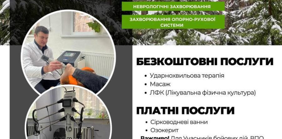 Для учасників бойових дій та інвалідів різних груп – послуги БЕЗКОШТОВНІ! Курс лікування – 2 тижні, куди входить триразове харчування, проживання та реабілітація. Детальніша інформація за вказаними номерами: 380 (97) 120 84 98 – Потупа Ярослав Іванович