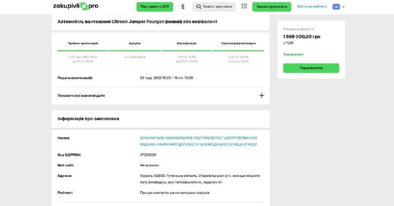Так вартість транспортного засобу становить 1 569 млн гривень. Наразі авто ще не поставлено продавцем, тож, відповідне перерахування коштів не здійснене.