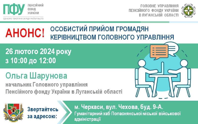 Керівництво ПФУ Луганщини прийме наших ВПО у Черкасах в понеділок 26 лютого у цьому місті відбудеться особистий… 23.02.2024, П’ятниця | 10:49 Автор допису: Голова Луганської обласної військової адміністрації Керівництво ПФУ Луганщини прийме наших ВПО у Черкасах в понеділок 26 лютого у цьому місті відбудеться особистий прийом начальника Головного управління Пенсійного фонду України в Луганській області Ольги Шарунової. Звертайтеся з 10:00 до 12:00 до хабу Попаснянської громади. 📍Адреса: м. Черкаси, вул. Чехова, буд. 9-А. Джерело Друк / PDF