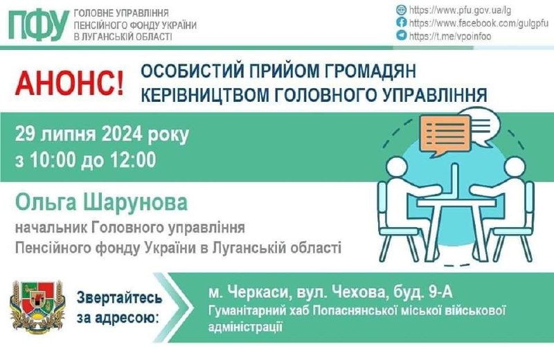 У понеділок очільниця пенсійної служби Луганщини прийматиме у Черкасах 28.07.2024, Неділя | 17:17 Автор допису: Голова Луганської обласної військової адміністрації У понеділок очільниця пенсійної служби Луганщини прийматиме у Черкасах 29 липня відбудеться особистий прийом начальника Головного управління Пенсійного фонду України в Луганській області Ольги Шарунової. Звертайтесь з 10:00 до 12:00 до гуманітарного хабу Попаснянської громади. 📍Адреса: м. Черкаси, вул. Чехова, буд. 9-А. Джерело Друк / PDF