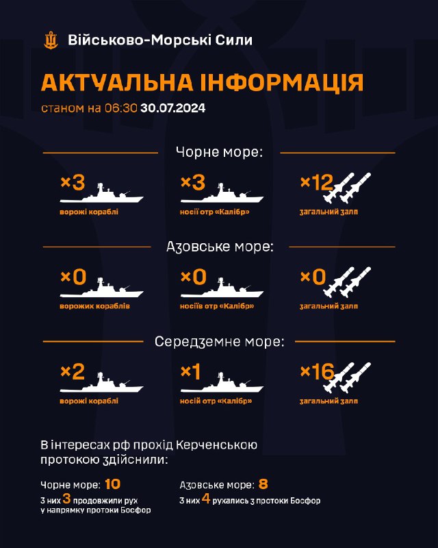 ▪️ В Чорному морі 3 ворожі кораблі, які є носіями крилатих ракет "Калібр" загальним залпом до 12 ракет;