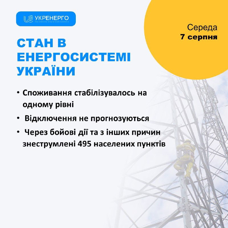 СТАН ЕНЕРГОСИСТЕМИ 🔹 Споживання стабілізувалось на одному рівні 🔹 Відключення не прогнозуються 7.08.2024, Середа | 12:48 Автор допису: Голова Луганської обласної військової адміністрації СТАН ЕНЕРГОСИСТЕМИ 🔹 Споживання стабілізувалось на одному рівні 🔹 Відключення не прогнозуються 🔹 Через бойові дії та з інших причин знеструмлені 495 населених пунктів. Джерело Друк / PDF