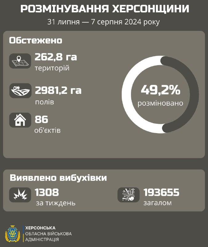 ⚠️Майже половину правобережної Херсонщини – розміновано.