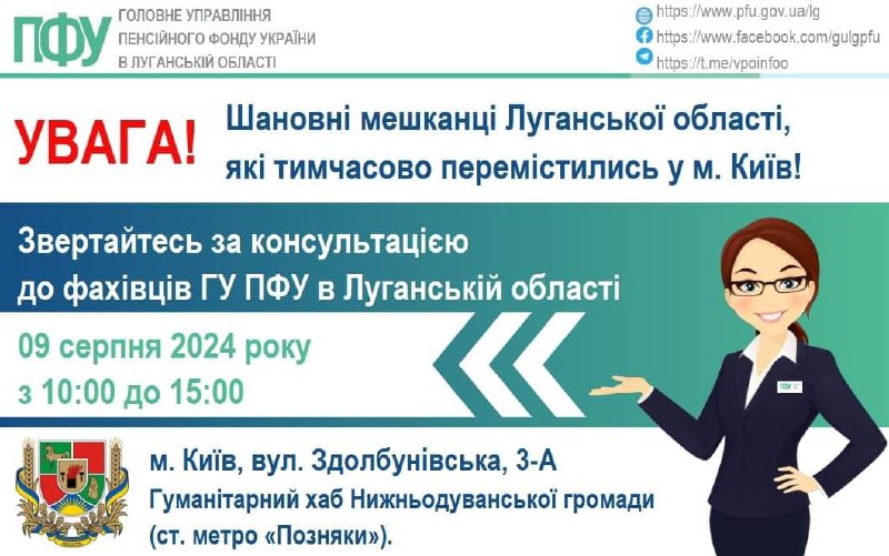 У Києві в п’ятницю звертайтеся до пенсійників Луганщини 9 серпня у хабі Нижньодуванської громади відбудеться… 8.08.2024, Четвер | 14:56 Автор допису: Голова Луганської обласної військової адміністрації У Києві в п’ятницю звертайтеся до пенсійників Луганщини 9 серпня у хабі Нижньодуванської громади відбудеться прийом внутрішньо переміщених осіб з Луганської області. Звернутися за вирішенням пенсійних питань можна з 10:00 до 15:00. 📍Адреса: м. Київ, вул. Здолбунівська, 3-А (ст. метро «Позняки»). Джерело Друк / PDF