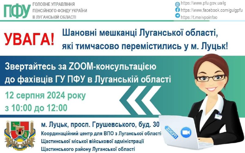 У понеділок в Луцьку роз’яснюватимуть питання пенсійного забезпечення 9.08.2024, П’ятниця | 19:28 Автор допису: Голова Луганської обласної військової адміністрації У понеділок в Луцьку роз’яснюватимуть питання пенсійного забезпечення 12 серпня з 10:00 до 12:00 фахівець Головного управління Пенсійного фонду України в Луганській області надаватиме онлайн-консультації у хабі Щастинської громади. 📍 Адреса: м. Луцьк, просп. Грушевського, буд. 30. Джерело Друк / PDF