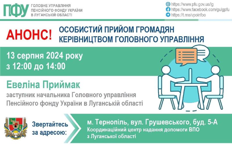 13 серпня керівництво ПФУ Луганщини прийматиме ВПО у Тернополі 13 серпня у місцевому хабі відбудеться особистий…