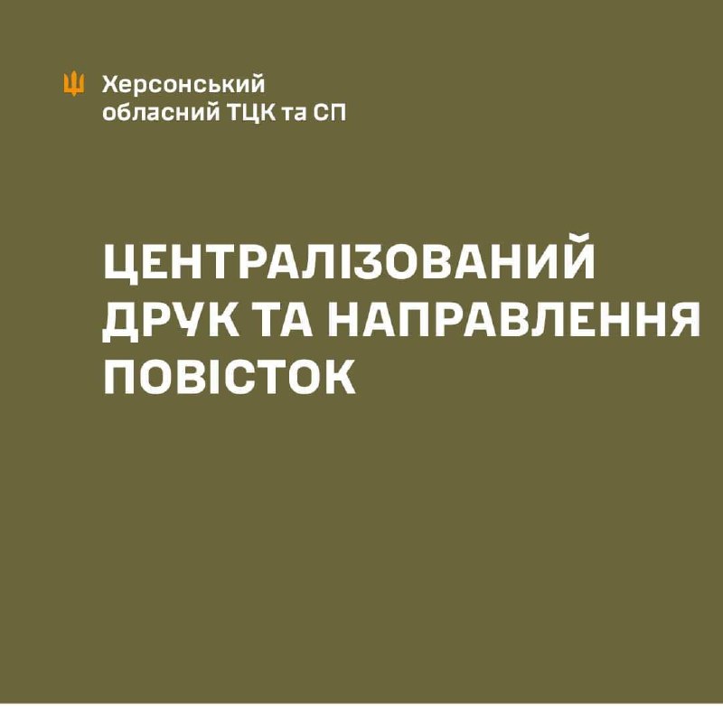 🔸Централізований друк повісток, які сформовані за допомогою Єдиного державного реєстру призовників, військовозобов'язаних та резервістів, здійснюється Міністерством оборони України (далі – Міноборони) або державними підприємствами, які мають стратегічне значення для економіки і безпеки держави (в поліграфічній галузі)