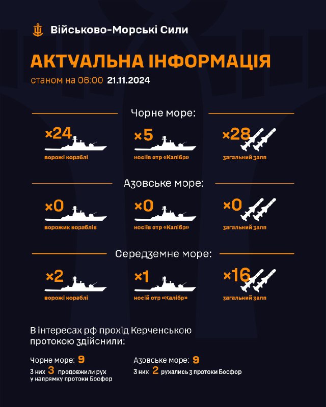 ▪ в Середземному морі 2 ворожі кораблі, з яких 1 є носієм крилатих ракет "Калібр" загальним залпом до 16 ракет.