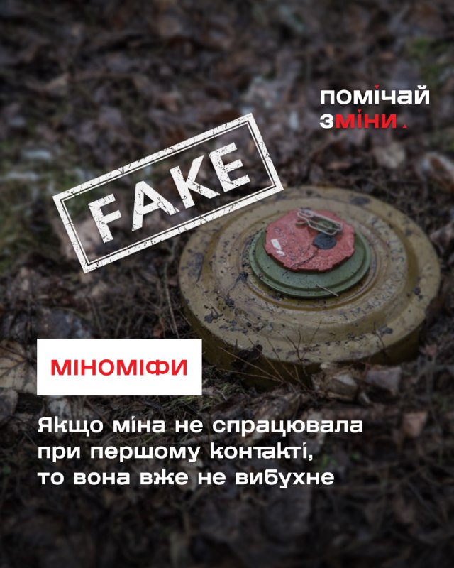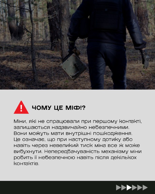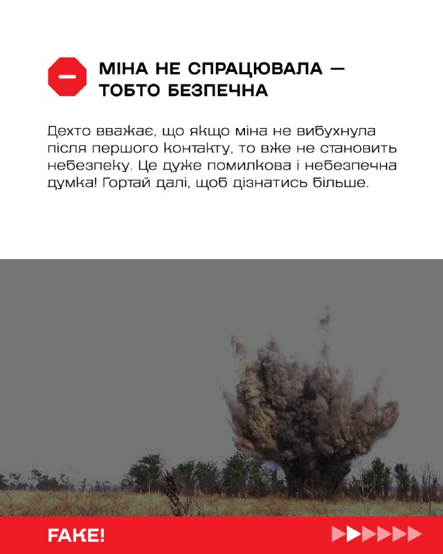 Один із небезпечних міфів каже: "Якщо міна або інший боєприпас не спрацювала при першому контакті, то вона вже не вибухне". Це неправда, яка може призвести до трагедії.