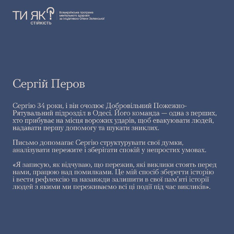 «Щоденники стійкості» — це про силу одного, що надихає мільйони. Читай практики письма наших героїв та приєднуйся до власної рефлексії на платформі «Ти як?» у розділі «Щоденники стійкості»: https://diary.howareu.com