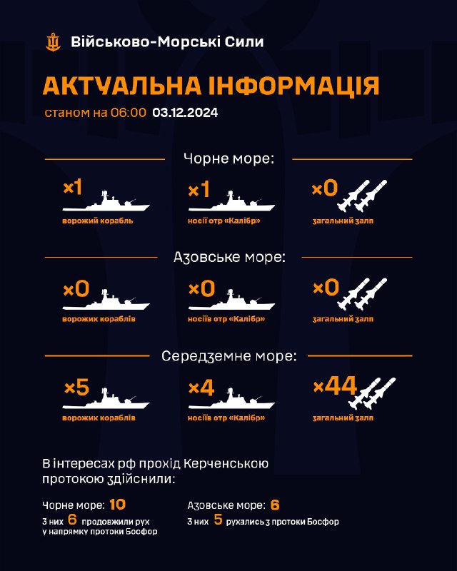 ‼ Актуальна інформація станом на 06:00 03.12.2024 Докладно 3.12.2024, Вівторок | 6:54 Автор допису: Військово-Морські Сили Збройних Сил України ‼ Актуальна інформація станом на 06:00 03.12.2024 Докладно Джерело Друк / PDF