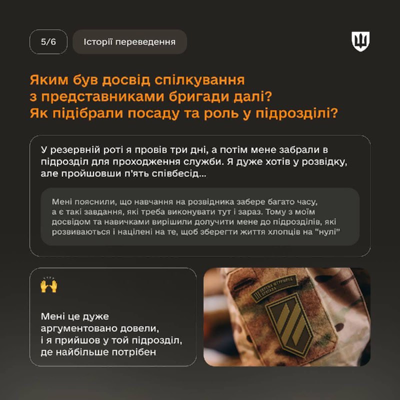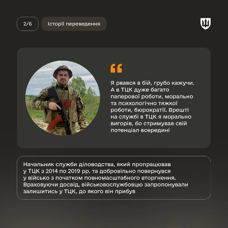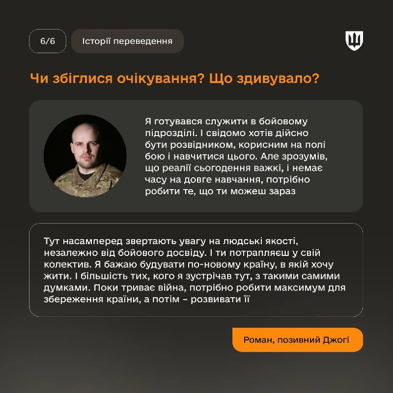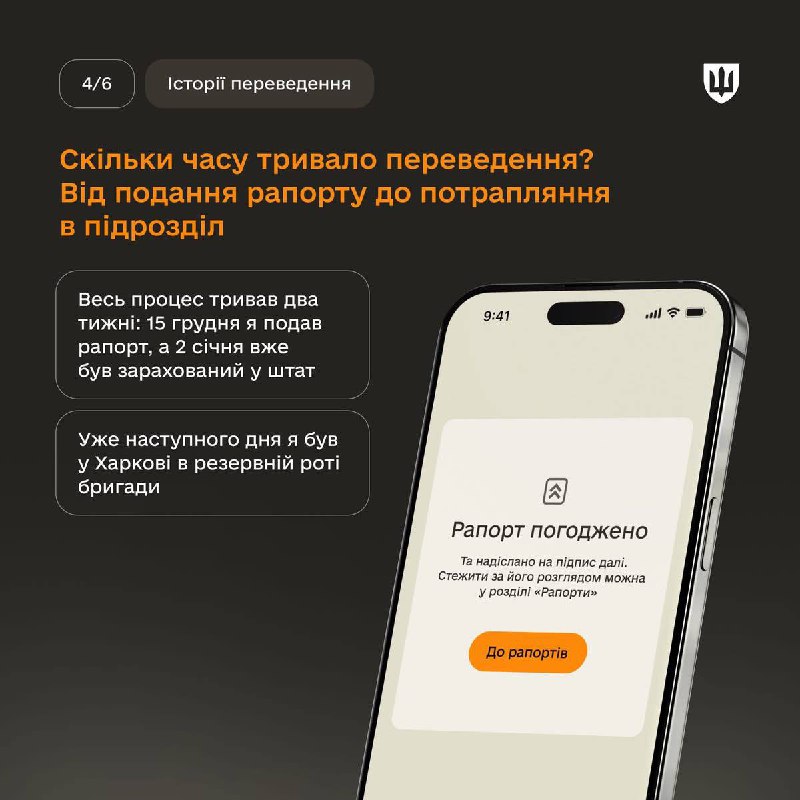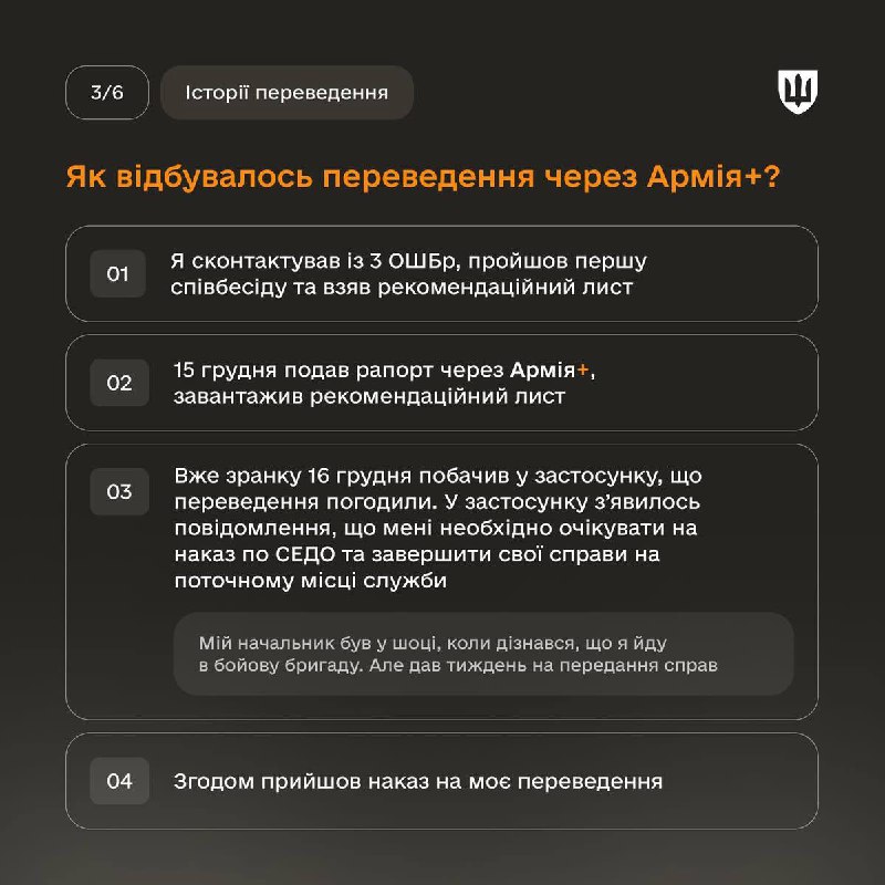 Як змінити підрозділ і скільки це займає часу? Чи справді можна зробити все онлайн? Відповідь найкраще знає той, хто вже пройшов цей шлях. 1.03.2025, Субота | 18:52 Автор допису: Херсонська обласна військова адміністрація Як змінити підрозділ і скільки це займає часу? Чи справді можна зробити все онлайн? Відповідь найкраще знає той, хто вже пройшов цей шлях. ⚔️ Військовий із позивним Джогі перевівся з ТЦК на бойову посаду в 3 ОШБр завдяки застосунку "Армія+". Як це працює — читайте в інфографіці 👆 Міністерство оборони України Джерело Друк / PDF