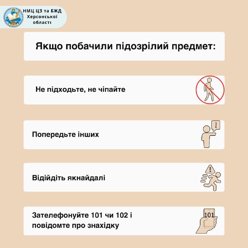 🔻Що робити, якщо ви помітили підозрілий предмет? ❌ Не підходьте та не торкайтесь його. ⚠️ Попередьте інших про небезпеку. ✅ Відійдіть на безпечну відстань. 📞 Повідомте про знахідку рятувальників чи правоохоронців за номером 101 або 102. Навчально-методичний Центр ЦЗ та БЖД Херсонської області