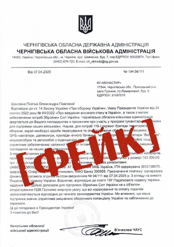 ‼️Будьте пильні. Чернігівська ОВА не проводить збору коштів чи іншої допомоги, а також не надавала дозволу іншим структурами чи благодійним організаціям діяти від свого імені. У разі надходжень таких «прохань перерахувати кошти» – раджу одразу звертатися до правоохоронців.