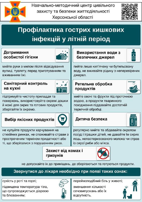 ☀️ У спеку ризик захворіти на гострі кишкові інфекції значно зростає. Найчастіше збудники потрапляють до організму через заражену їжу та воду, немиті овочі й фрукти, молочні та м’ясні продукти, а також під час купання у забруднених водоймах.