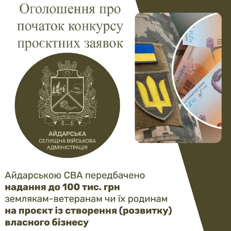 Айдарська СВА оголосила про початок конкурсу проєктних заявок ветеранів та членів їхніх сімей на створення та розвиток власного бізнесу