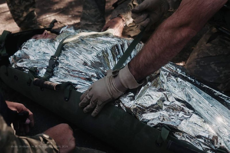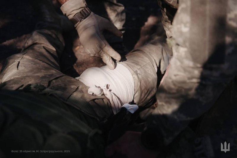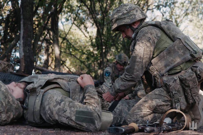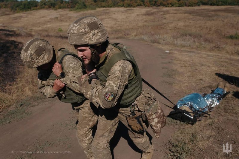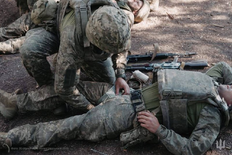 🇺🇦⚓️Морпіхи 35 окрема бригада морської піхоти ім.контр-адмірала Михайла Остроградського відпрацьовують домедичну допомогу на полігоні — зупинку кровотечі та евакуацію поранених у безпечну зону.