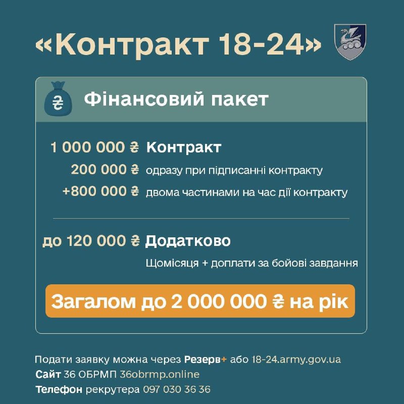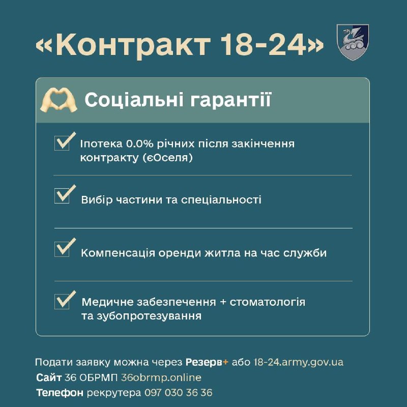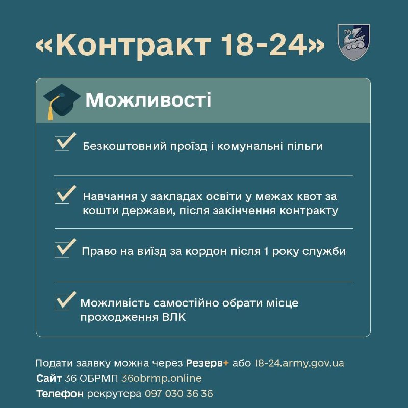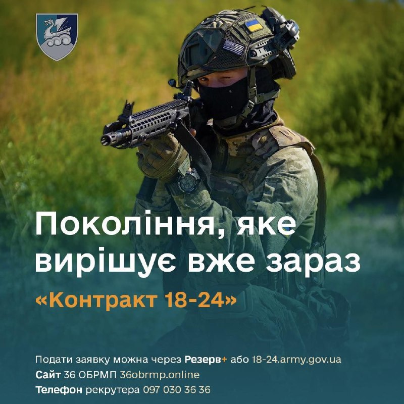 🔱 Долучайся до морпіхів 36-ї ОБрМП у межах державної програми “Контракт 18–24”. 3.10.2025, П’ятниця | 18:18 Автор допису: Херсонська обласна військова адміністрація 🔱 Долучайся до морпіхів 36-ї ОБрМП у межах державної програми "Контракт 18–24". Це добровільна ініціатива для молодих рекрутів, яка дозволяє отримати конкурентні виплати, престижний досвід та соціальні гарантії від держави. На інфографіці — усі можливості, які відкриває служба за програмою у складі підрозділу миколаївських морпіхів. 👉 Подавай заявку на сайті 18-24.army.gov.ua чи в застосунку Резерв+ або звертайся за телефоном 0970303636. Джерело Друк / PDF