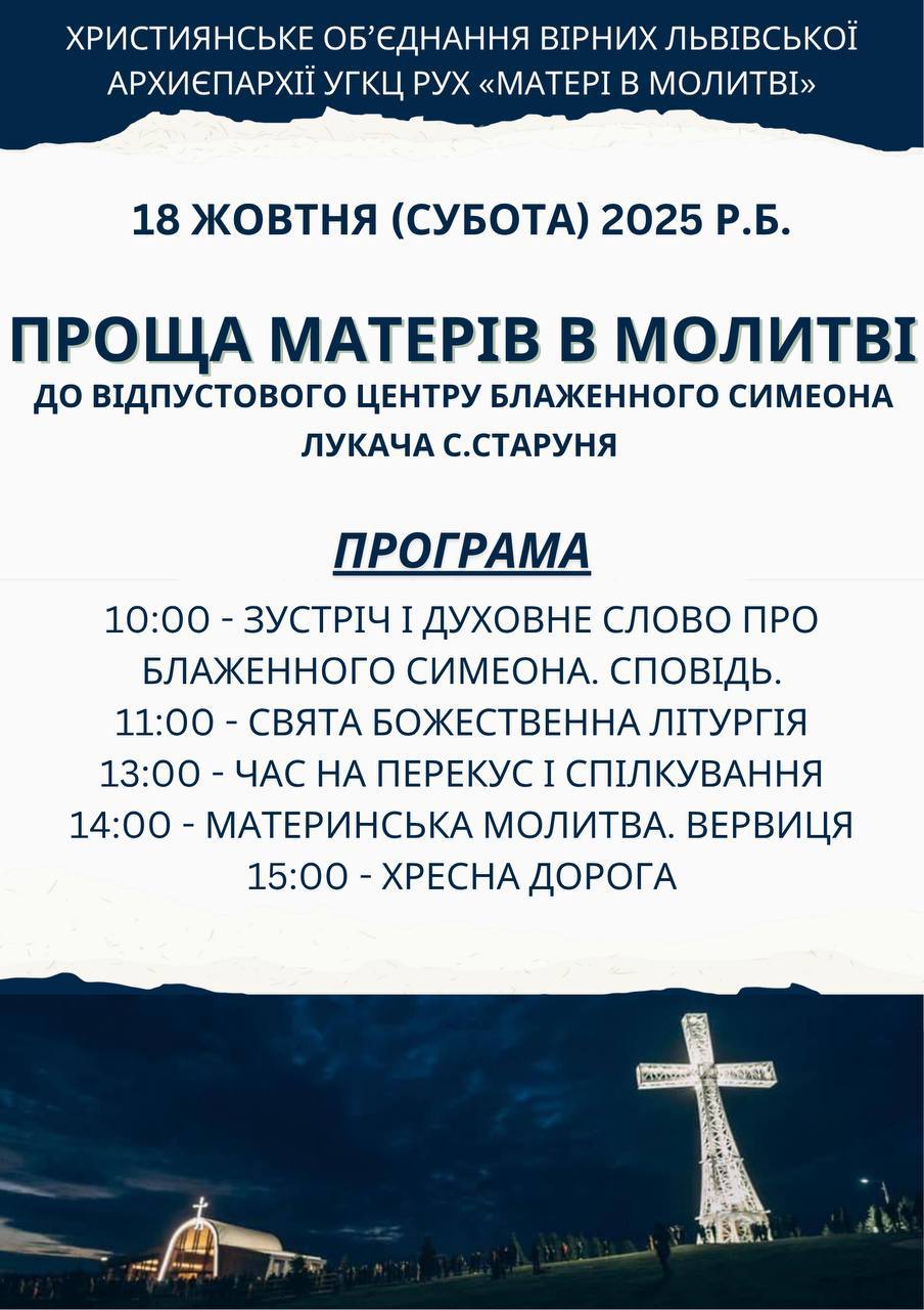 18 жовтня 2025 року (субота) відбудеться проща Матерів у Молитві Львівської Архиєпархії УГКЦ до відпустового центру блаженного Симеона Лукача у селі Старуня.