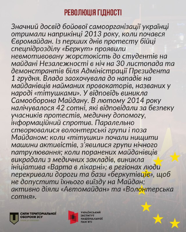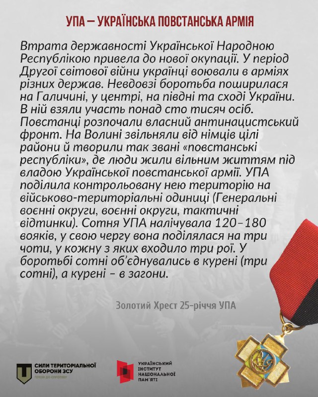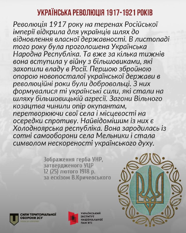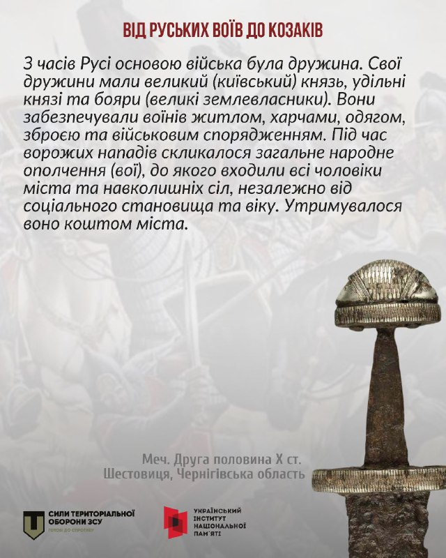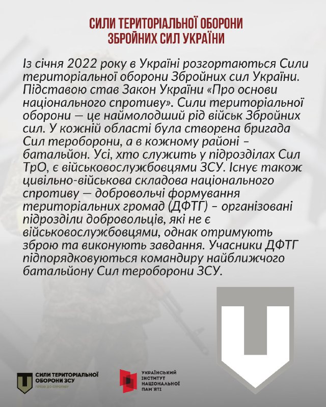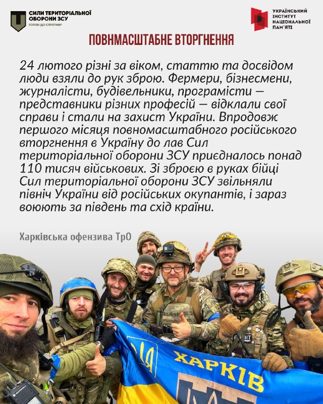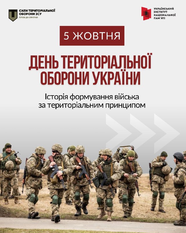 ВОНИ ПІШЛИ ОБОРОНЯТИ СВІЙ ДІМ День територіальної оборони України відзначається щороку у першу неділю жовтня з 2020-го 5.10.2025, Неділя | 11:04 Автор допису: Український інститут національної пам'яті ВОНИ ПІШЛИ ОБОРОНЯТИ СВІЙ ДІМ День територіальної оборони України відзначається щороку у першу неділю жовтня з 2020-го. Українцям здавна було властиво відкладати звичні життєві справи та брати до рук зброю, щоб захистити свою землю⚔️ Щоб дізнатися, як традиція самооборони проявлялася в різні історичні періоди, – гортайте карусель🔼 Матеріал створений на основі виставки «Кожен із нас – воїн». Це спільний проєкт Сил територіальної оборони ЗСУ та Українського інституту національної пам’яті, який був створений у 2022 році. Подивитися виставку можна за посиланням на сайті. #тероборона #тро #ЗСУ Джерело Друк / PDF