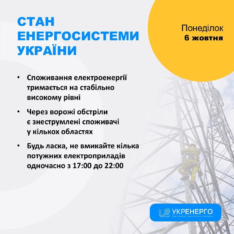 ❗ Враховуючи погодні умови, сьогодні зберігається необхідність в ощадливому енергоспоживанні. Будь ласка, не вмикайте кілька потужних електроприладів одночасно у вечірні години пікового навантаження на енергосистему з 17:00 до 22:00.