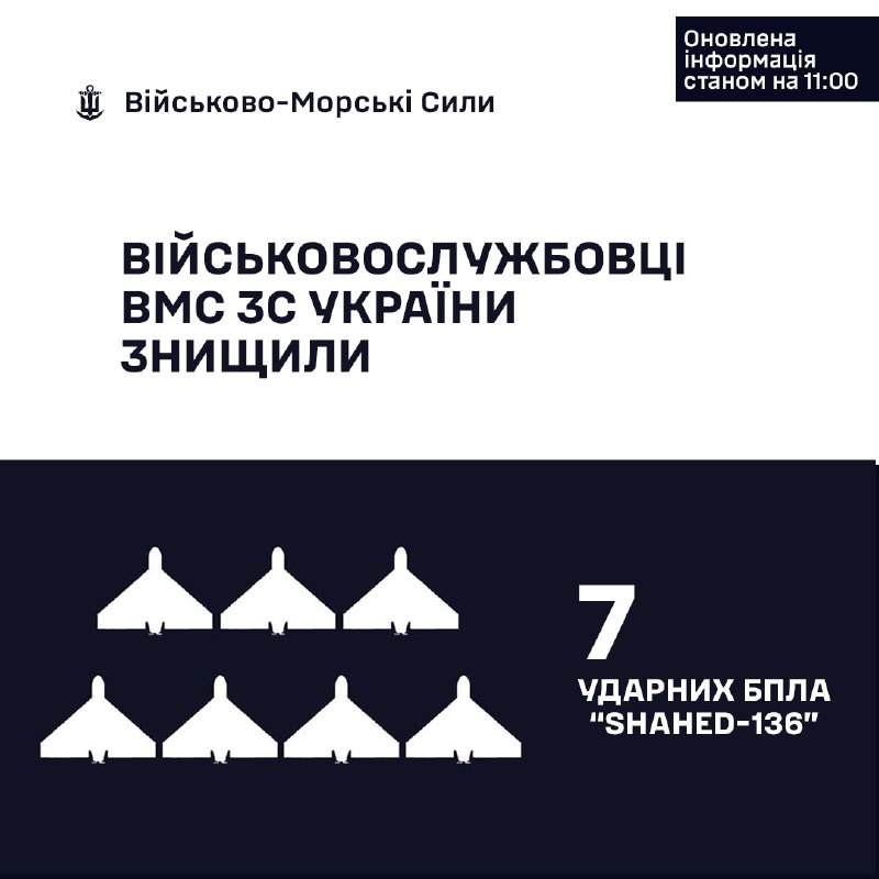 Під час повітряної атаки російських окупантів військовослужбовці Військово-Морських Сил Збройних Сил України разом з побратимами знищили 7 ворожих дронів-камікадзе "SHAHED-136".