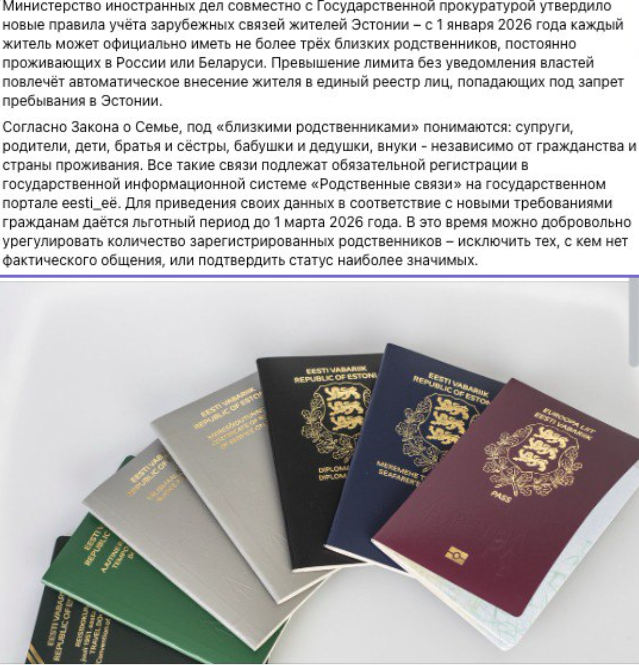 У проросійському сегменті мережі поширилася новина про нібито нову законодавчу ініціативу, прийняту в Естонії. Згідно з нею, громадянам країни буцімто доведеться повідомляти уряд про наявність родичів у Росії чи Білорусі, а більше трьох таких зв’язків мати заборонять. «Це не заборона на сім’ю – це захід національної безпеки. Чим ширші закордонні зв’язки людини, тим вищі ризики впливу на неї ззовні. Три родичі – розумний баланс між гуманністю та захистом суверенітету на підставі нетрадиційних сімейних цінностей», нібито прокоментував нововведення міністр закордонних справ Маргус Цакхна.