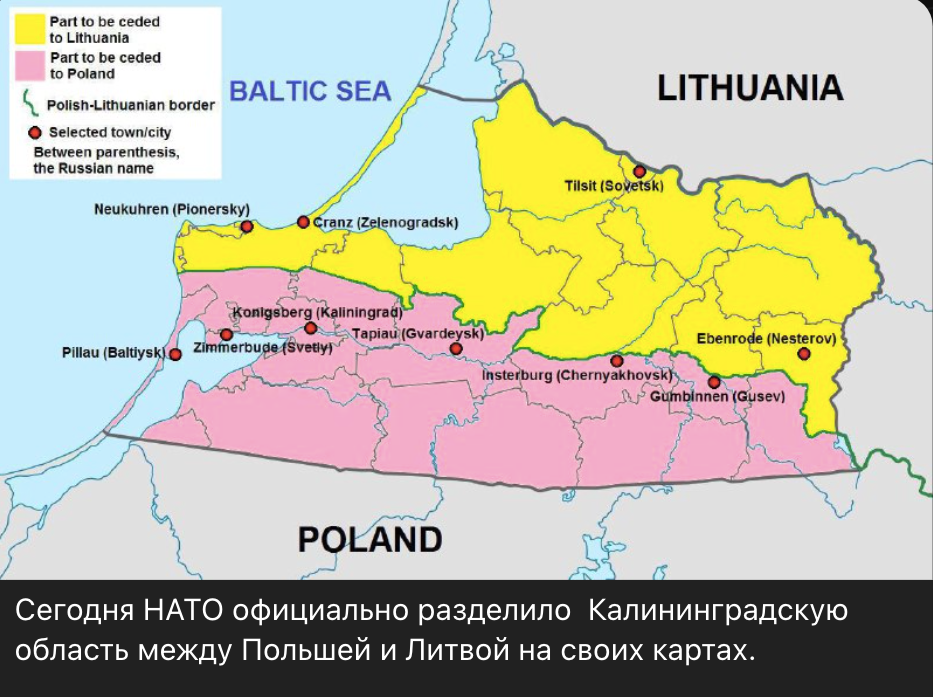 Російські пропагандисти пишуть, що НАТО буцімто офіційно розділило Калінінградську область між Польщею та Литвою на власних мапах. При цьому жодна з публікацій на цю тему не пояснює контексту так званого поділу і не містить посилань на джерела — зображення мапи залишається єдиним доказом новини.