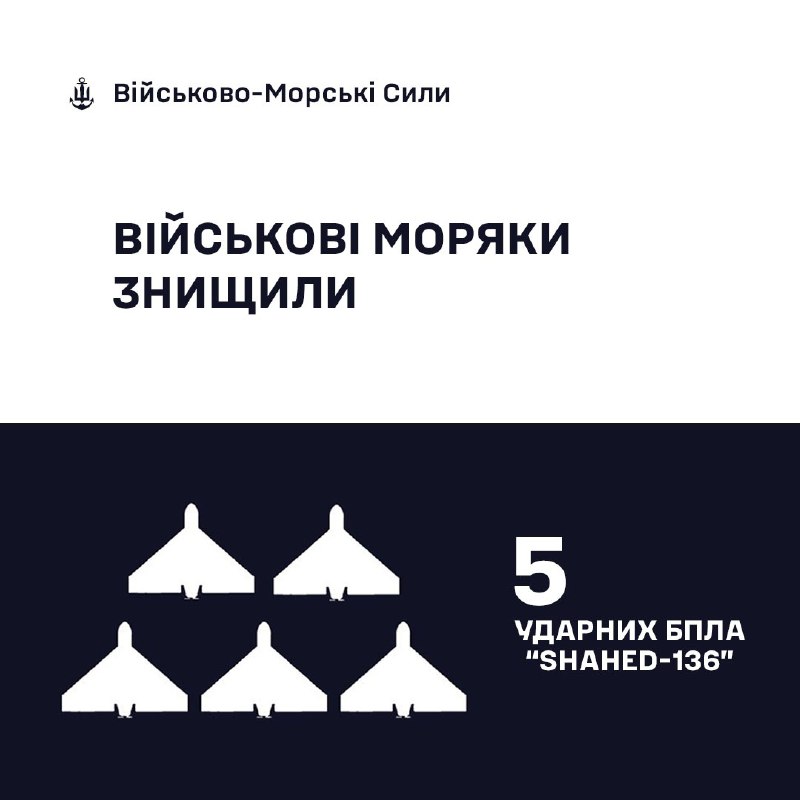 Сьогодні вночі під час повітряної атаки російських окупантів силами та засобами Військово-Морських Сил Збройних Сил України було збито 5 ворожих дронів-камікадзе "SHAHED-136".