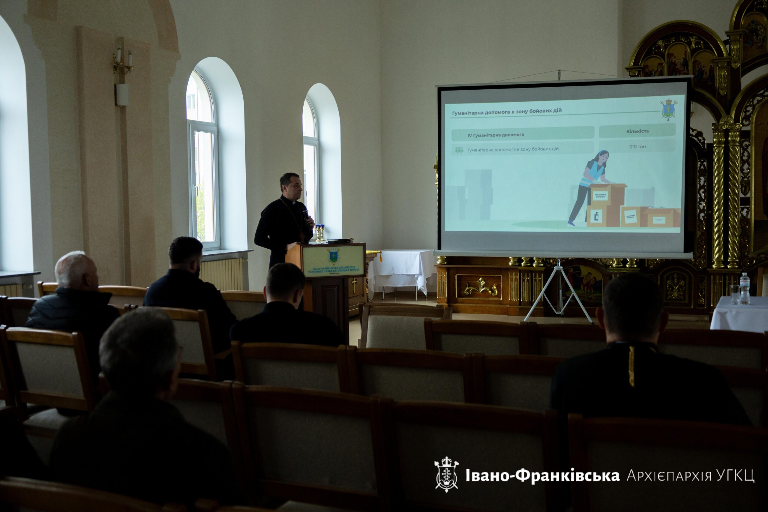 Владика звернувся до священників із особистим заохоченням: «Ви є прикладом для інших, і хотілося б, щоб цей приклад поширювався задля допомоги людям. У наших парафіях є багато військових, які зараз захищають нашу Батьківщину і нас із вами. А як щодо їхніх сімей? Як вони живуть? Можливо, у когось залишилася старенька, самотня мама чи діти. А ще гірше, коли людина загинула, а про її рідних усі забули. Якщо Церква відвернеться, то хто тоді має їм допомогти? Те ж саме стосується самотніх старших людей. Стараймося, щоб ми забезпечували їм не лише духовне життя. Бо саме ми — найближчі, ми знаємо справжні потреби наших людей».