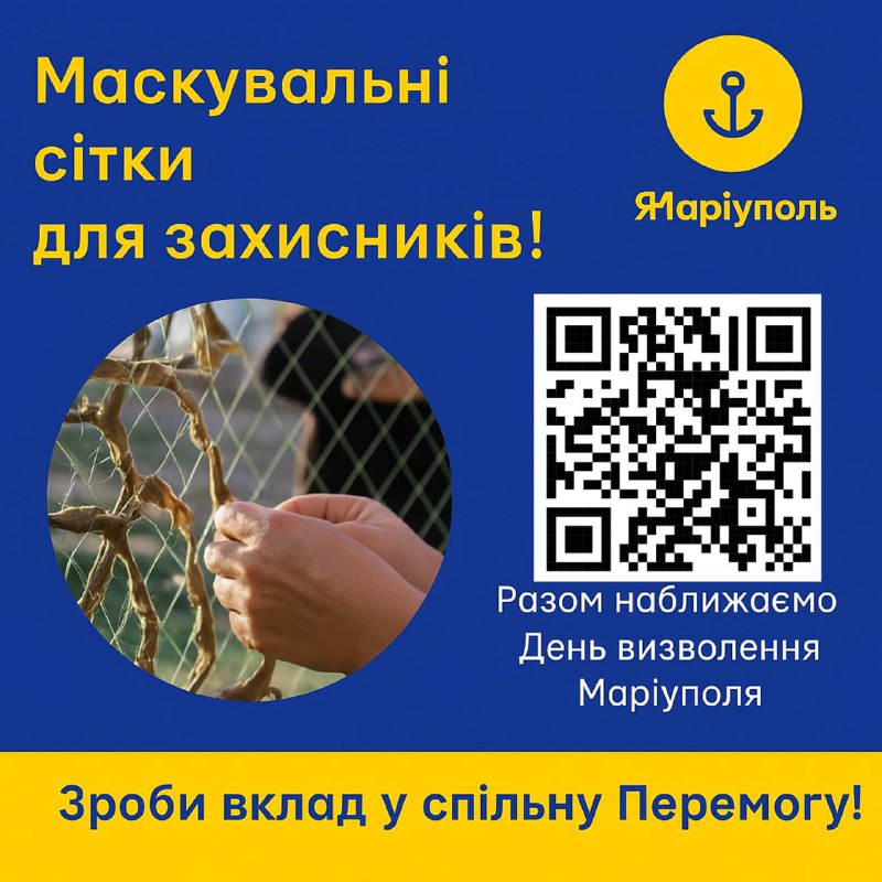 ⚓️ Активні бойові дії та зміна пори року вимагають постійного оновлення наявних маскувальних сіток. Тому Благодійний фонд "Я – Маріуполь" розпочинає новий збір на матеріали для плетіння маскувальних сіток. Мета – зібрати 120 тисяч гривень.