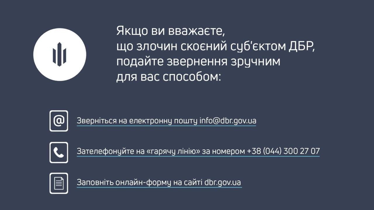 написати на електронну пошту info@dbr.gov.ua; зателефонувати на “гарячу лінію” за номером +38 (044) 300 27 07; заповнити онлайн-форму на сайті dbr.gov.ua; особисто звернутися до приймальні громадян у Києві, вул. Симона Петлюри, 15.