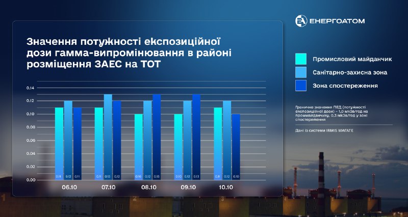 З 06 по 10 жовтня 2025 року потужність експозиційної дози гамма-випромінювання в районі розміщення Запорізької АЕС на тимчасово окупованих територіях України відповідала чинним нормам.