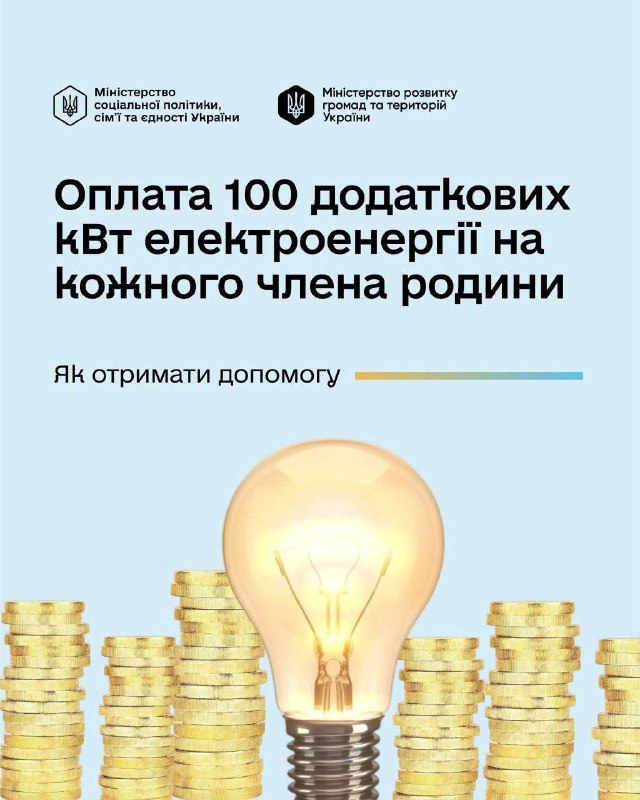 Кошти нараховуватимуться автоматично 📍разом із субсидіями та пільгами; 📍за нормою 100 кВт·год на кожну людину, але не більше 300 кВт·год на сім’ю. Це 432 грн на одного члена сім'ї, максимальна виплата – 1296 грн на домогосподарство.