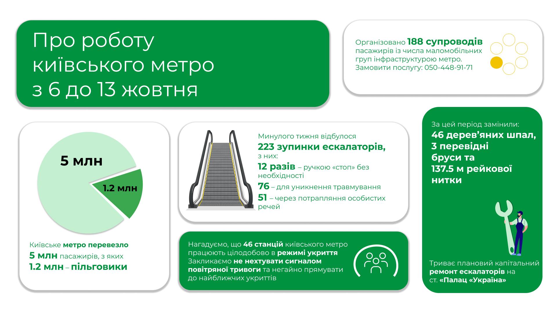 У цей період також фахівці організували 188 супроводів пасажирів із числа маломобільних груп інфраструктурою метрополітену. У підприємстві нагадують, що для замовлення супроводу необхідно зателефонувати за номерами: (044) 238-55-11 або 050-448-91-71, та повідомити маршрут поїздки підземкою. І рекомендують телефонувати за годину до запланованої поїздки, аби працівник метро очікував біля початкової станції.
