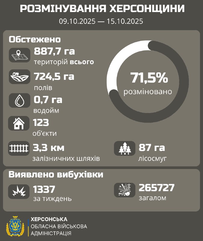 ⚠ Сапери продовжують очищувати правобережжя Херсонщини від вибухонебезпечних предметів. 16.10.2025, Четвер | 19:28 Автор допису: Херсонська обласна військова адміністрація ⚠ Сапери продовжують очищувати правобережжя Херсонщини від вибухонебезпечних предметів. Упродовж тижня фахівці розміновували сільськогосподарські угіддя, водойми, залізничні шляхи, лісосмуги та об'єкти інфраструктури. Прогрес розмінування – на інфографіці 👆 Джерело Друк / PDF