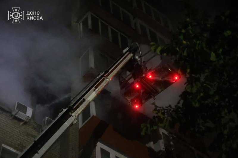 Дарницький район: Внаслідок влучання БпЛА горіли поверхи з 11 по 16 у 17-поверхівці. Врятовано 15 людей, з них 2 дитини. Також горіла двоповерхова нежитлова будівля — пожежу локалізовано.