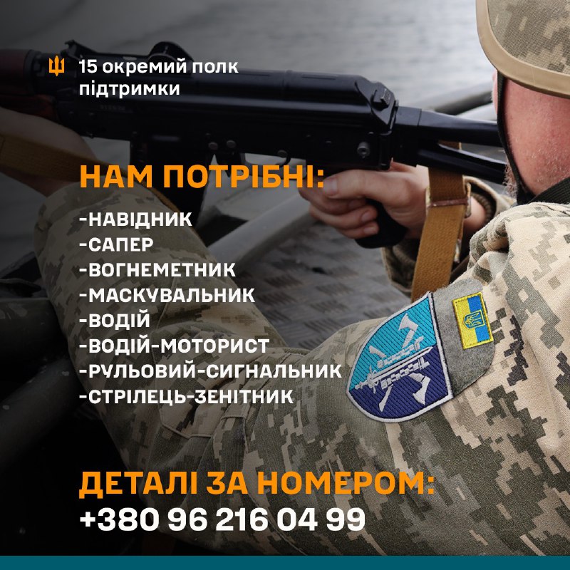 15-й окремий полк підтримки шукає тих, хто готовий стояти пліч-о-пліч із найкращими. Тут служать ті, хто не боїться викликів, цінує дисципліну та знає справжню ціну свободи. ⚔