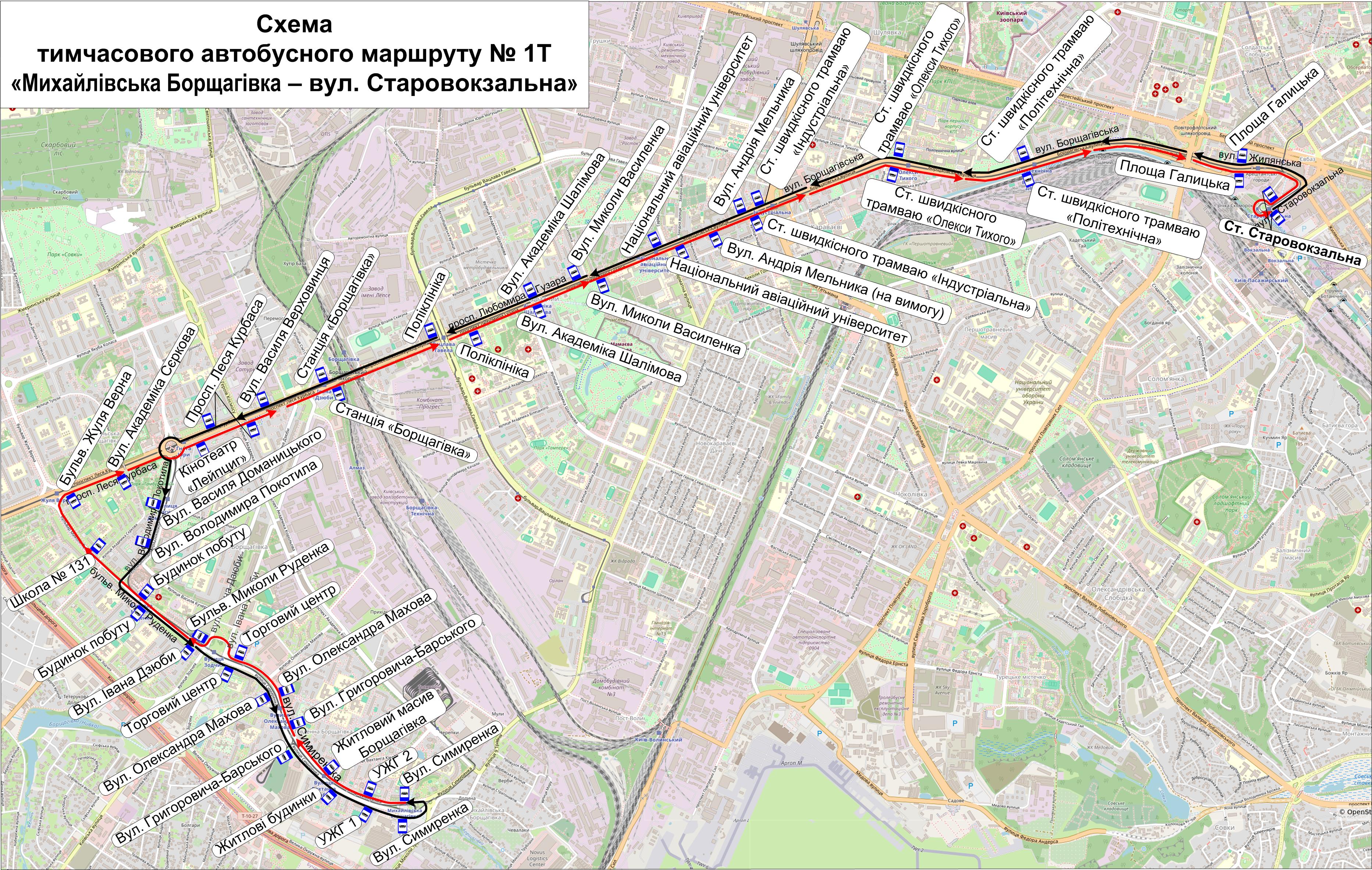 - № 1-Т «Михайлівська Борщагівка – вул. Старовокзальна» – вул. Симиренка – бульв. Миколи Руденка – просп. Леся Курбаса – просп. Любомира Гузара – вул. Борщагівська – вул. Жилянська – вул. Старовокзальна – вул. Жилянська – вул. Борщагівська – просп. Любомира Гузара – просп. Леся Курбаса – вул. Володимира Покотила – бульв. Миколи Руденка – вул. Симиренка;