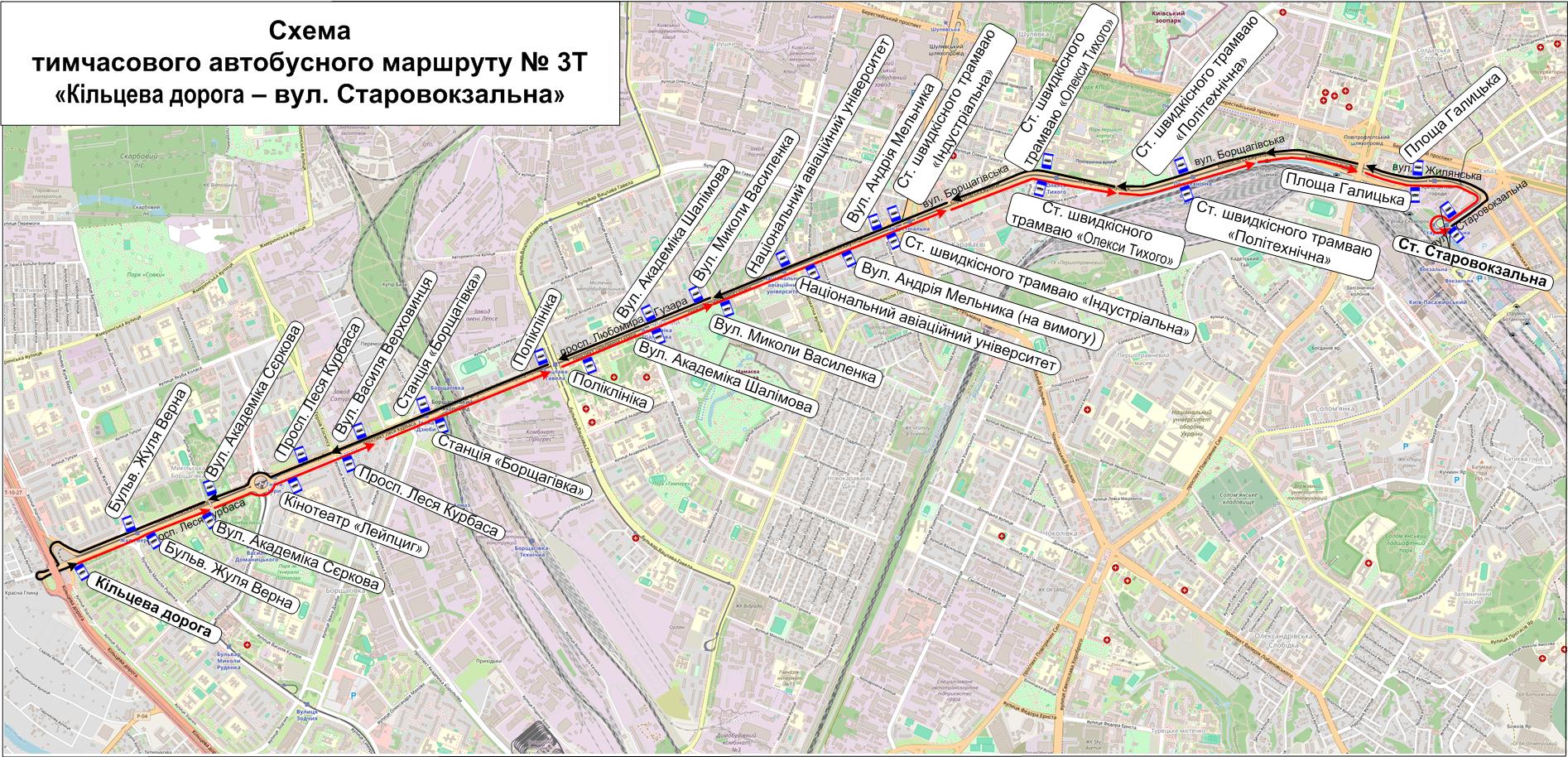 - № 3-Т «Кільцева дорога – вул. Старовокзальна» – просп. Леся Курбаса – просп. Любомира Гузара – вул. Борщагівська – вул. Жилянська – вул. Старовокзальна;