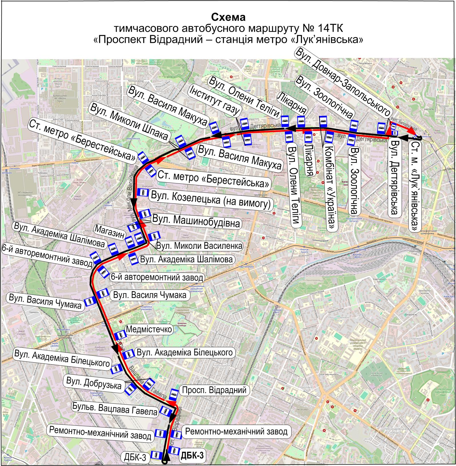 - № 14-ТК «Проспект Відрадний – станція метро «Лук’янівська» – просп. Відрадний – бульв. Вацлава Гавела – вул. Миколи Василенка – вул. Дегтярівська – вул. Митрофана Довнар-Запольського – вул. Білоруська – Лук’янівська площа – вул. Дегтярівська – вул. Миколи Василенка – бульв. Вацлава Гавела – просп. Відрадний.
