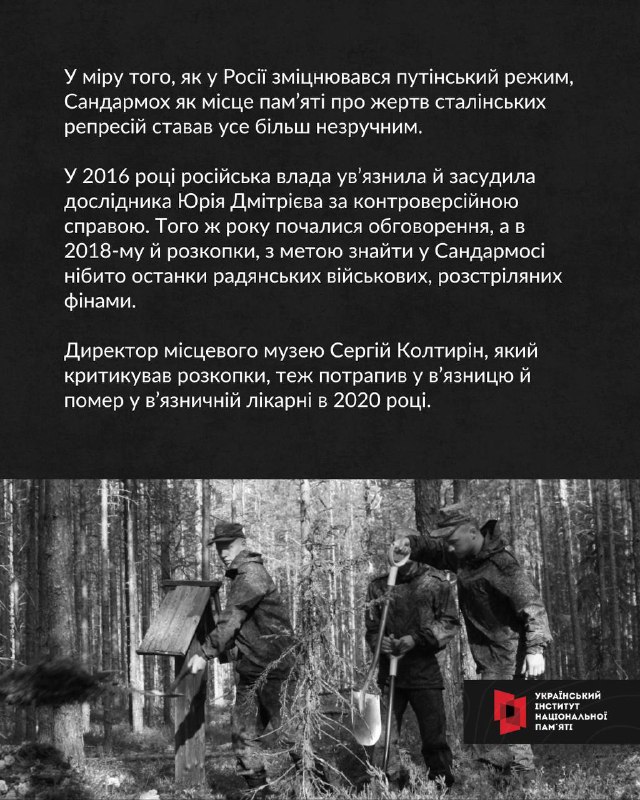 Сьогодні Сандармох асоціюється ще й зі спробами російської влади знову стерти памʼять про політичні репресії совєцького часу, принаймні у своєму суспільстві.