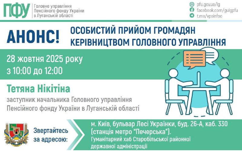 У хабі Старобільської РДА 28 жовтня відбудеться особистий прийом заступника начальника Головного управління Пенсійного фонду України в Луганській області Тетяни Нікітіної.