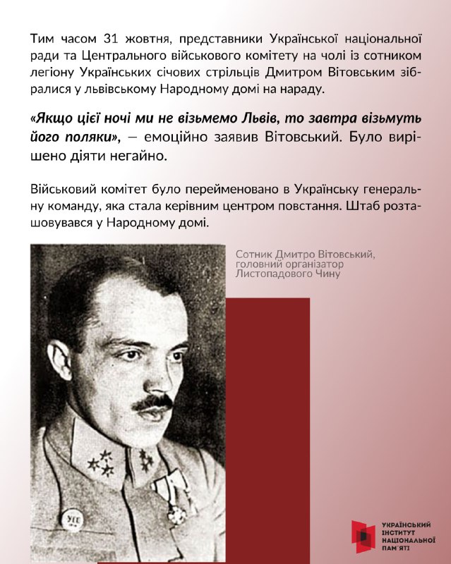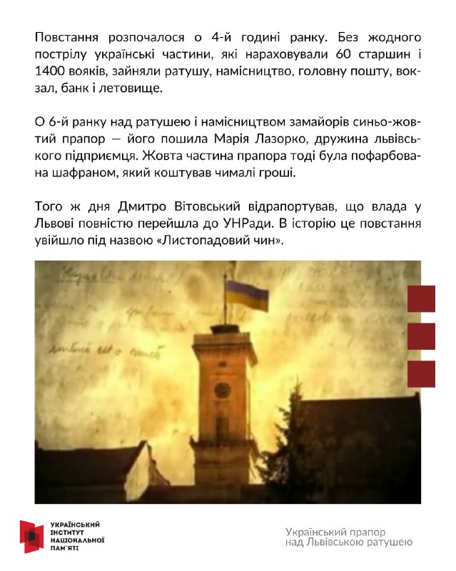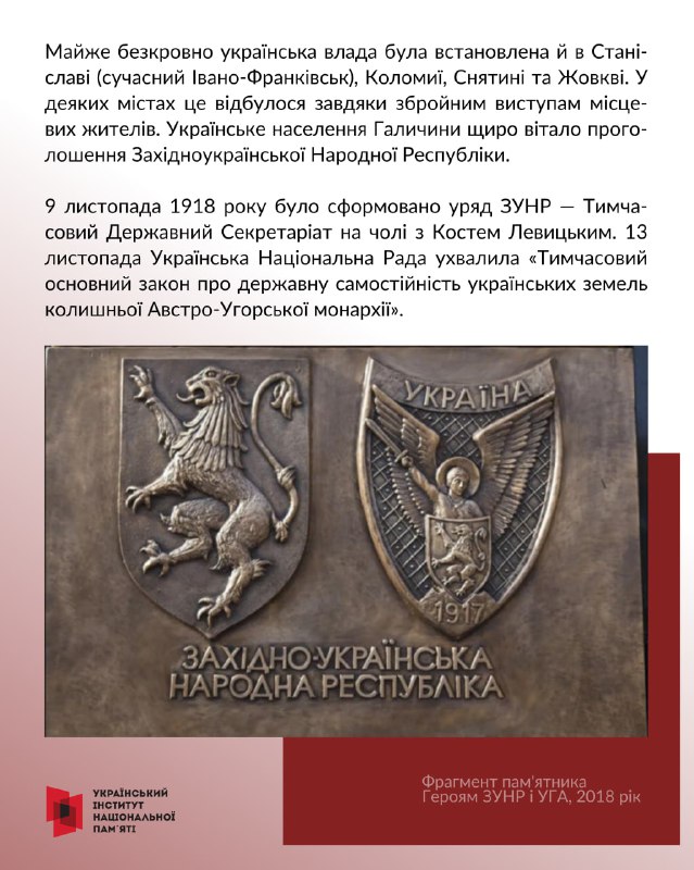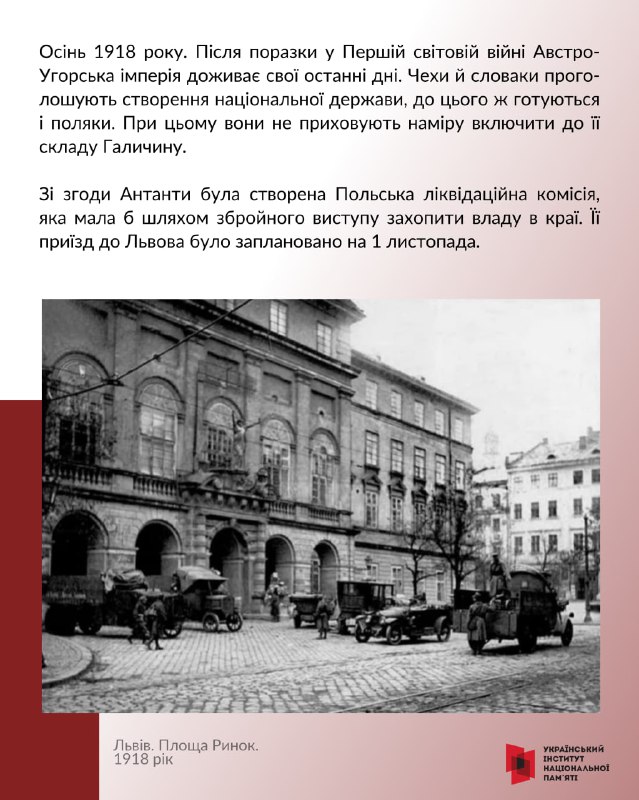 В історії держав і народів іноді навіть один день може стати вирішальним. Для українців Галичини таким днем стало 1 листопада 1918 року, коли у Львові відбулися революційній події, що увійшли в історію як «Листопадовий Чин» або «Листопадовий Здвиг».