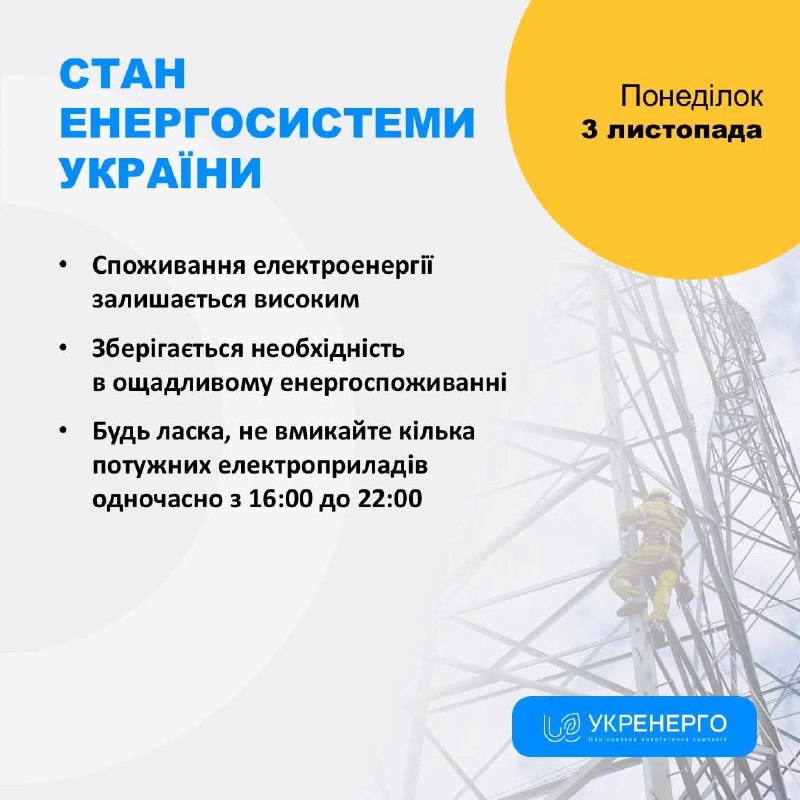 ❗ Завдяки здійсненим аварійно-відновлювальним роботам – на даний час графіки погодинних відключень та обмеження потужності для промислових споживачів скасовані в усіх регіонах. Повернення заходів обмеження прогнозується на період вечірнього піку споживання – з 16:00 до 22:00. Будь ласка, стежте за повідомленнями на офіційних сторінках обленерго у вашому регіоні.