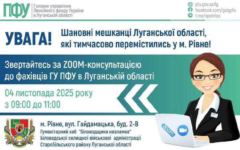 4 листопада з 9:00 до 11:00 у гуманітарному хабі Біловодської громади у м. Рівне відбудеться онлайн-консультування від фахівця Головного управління Пенсійного фонду України в Луганській області.