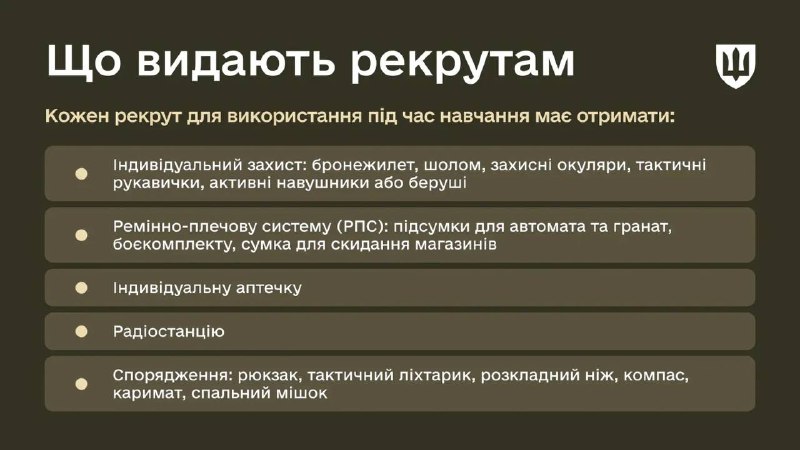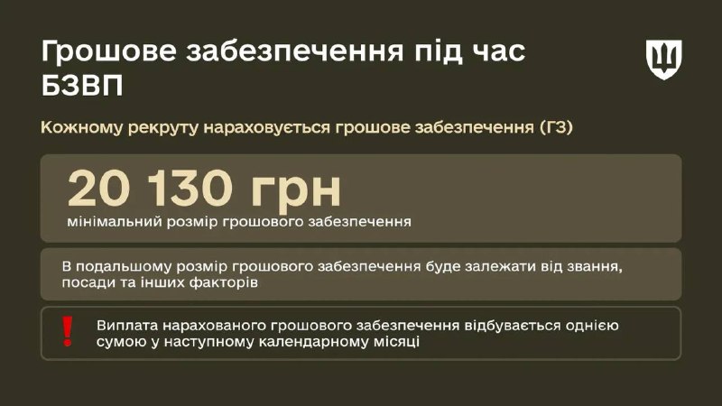 💰Забезпечення: Рекрути отримують форму, засоби захисту, аптечку, спорядження та грошове забезпечення від 20 130 грн/міс з першого дня навчання.