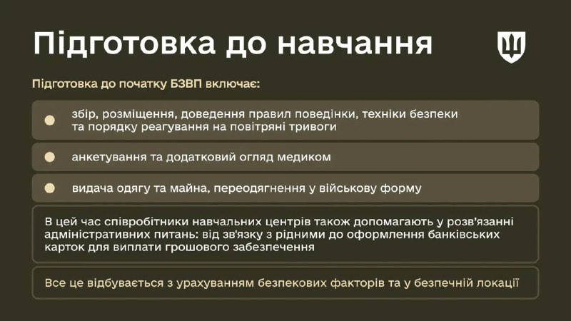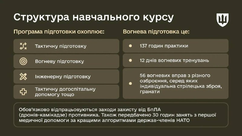 📚Структура: Базова підготовка триває 51 день. Перший день рекрути знайомляться з навчальною локацією та правилами безпеки. Далі 21 день присвячено індивідуальній підготовці, ще 17 днів — навчанні дій у складі підрозділу. На завершення проводиться триденне комплексне тактичне заняття.