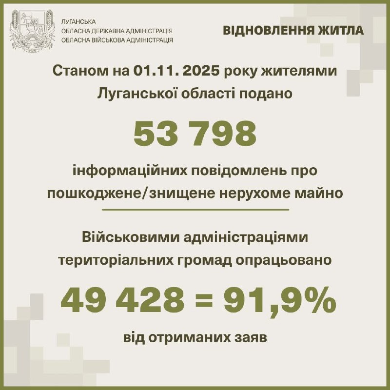 Наразі жителями області подано 53 798 інформаційних повідомлень про зруйноване або пошкоджене росіянами житло.